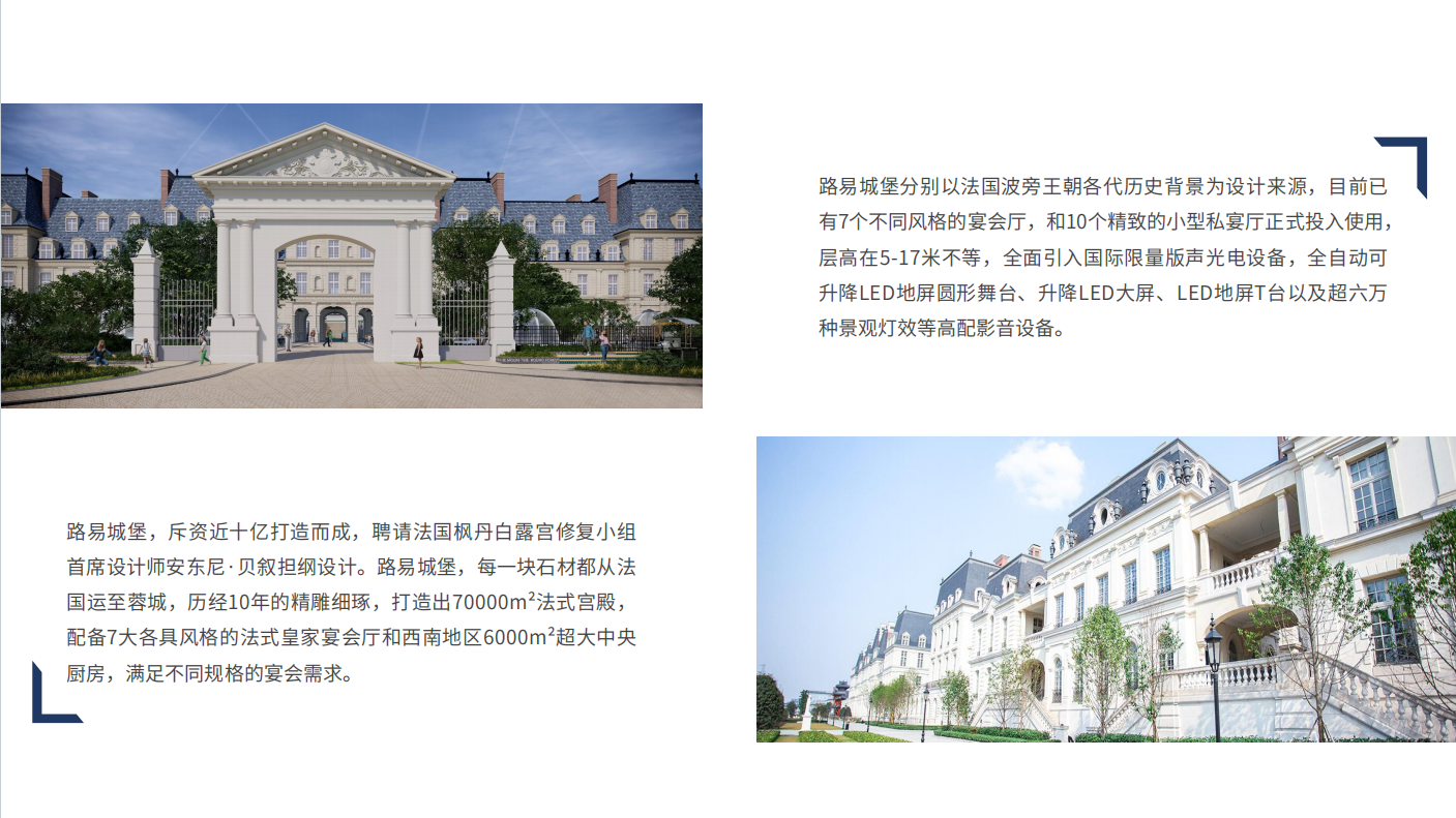 路易城堡,斥資近十億打造而成,聘請法國楓丹白露宮修複小組首席設計師安東(dōng)尼·貝敘擔綱(gāng)設計。路易城堡,每一塊石材都從法國運至蓉城(chéng),曆經10年的精雕細琢,打造出70000m²法式(shì)宮殿,配備7大各具風格的法式皇(huáng)家宴會(huì)廳和西南地(dì)區6000m²超大中央廚(chú)房(fáng),滿足不同規格的宴會需求。